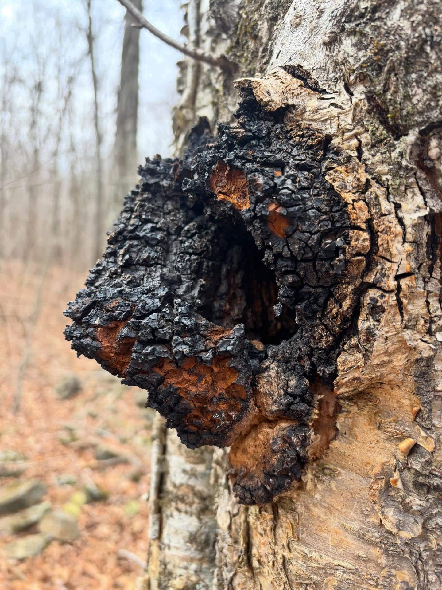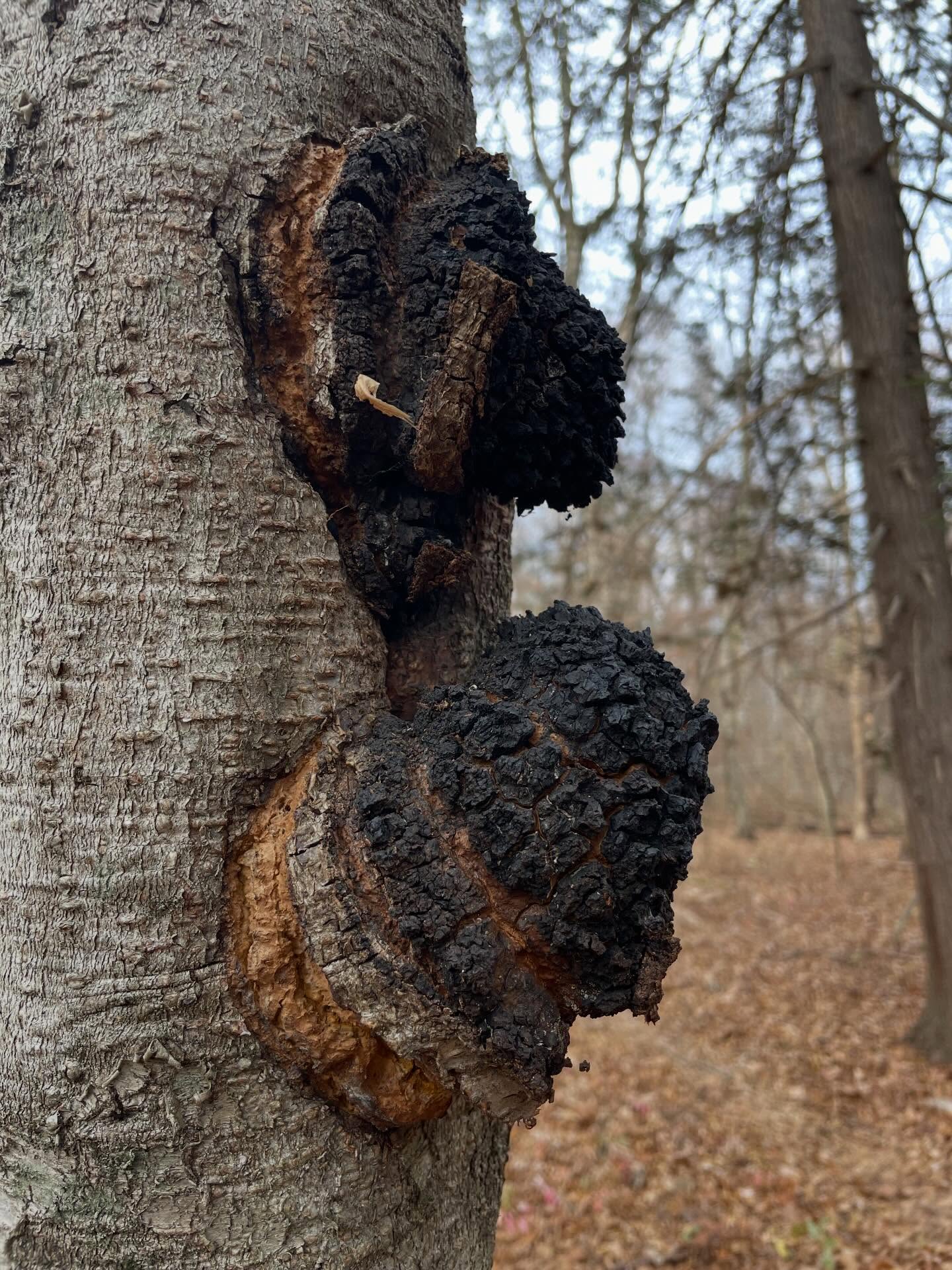 Chaga (Inonotus obliquus) is a medicinal mycelial mass that can be found growing on birch trees.